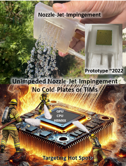 Unlike microchannel cold plates that rely on long flow paths and high pressure drop, MezzoFluidics uses discrete nozzle-impingement-jets to directly impinge coolant onto the heat-generating surfaces... directly to GPU and High Bandwidth Memory (HBM) chips.